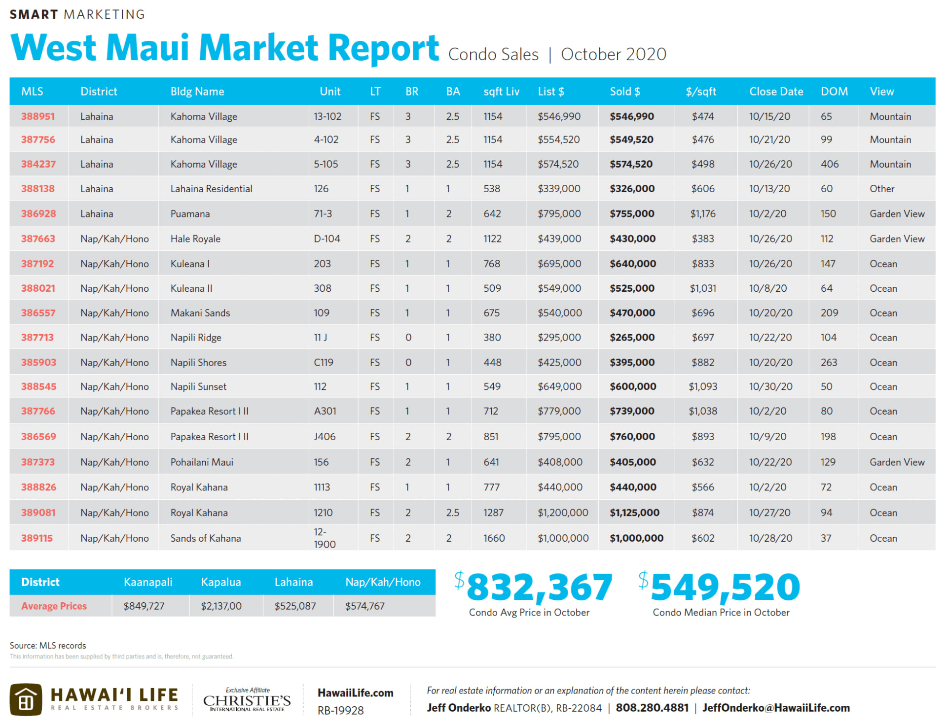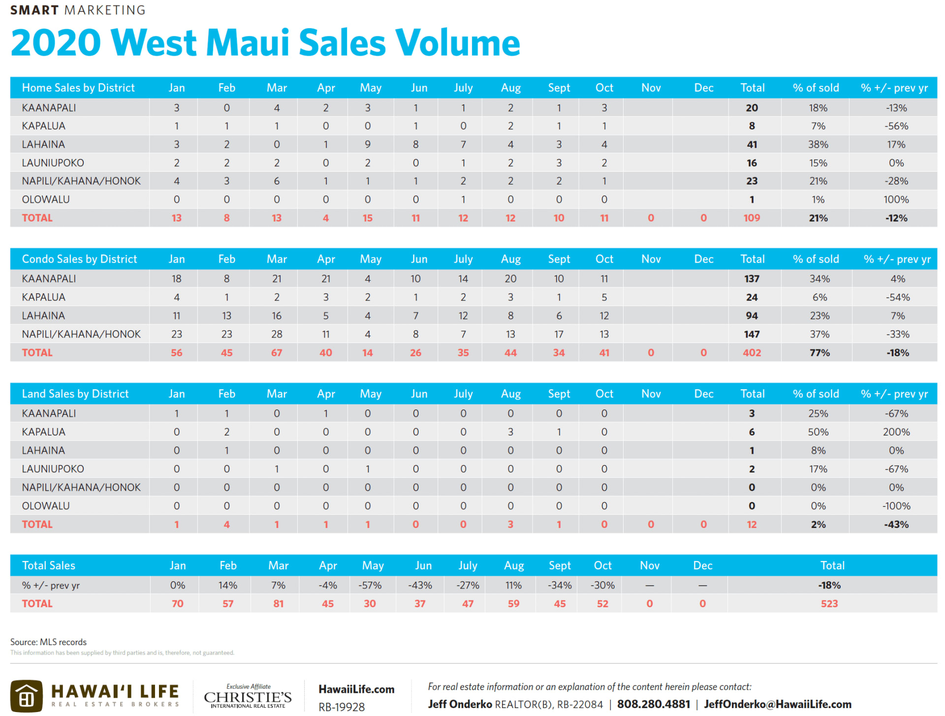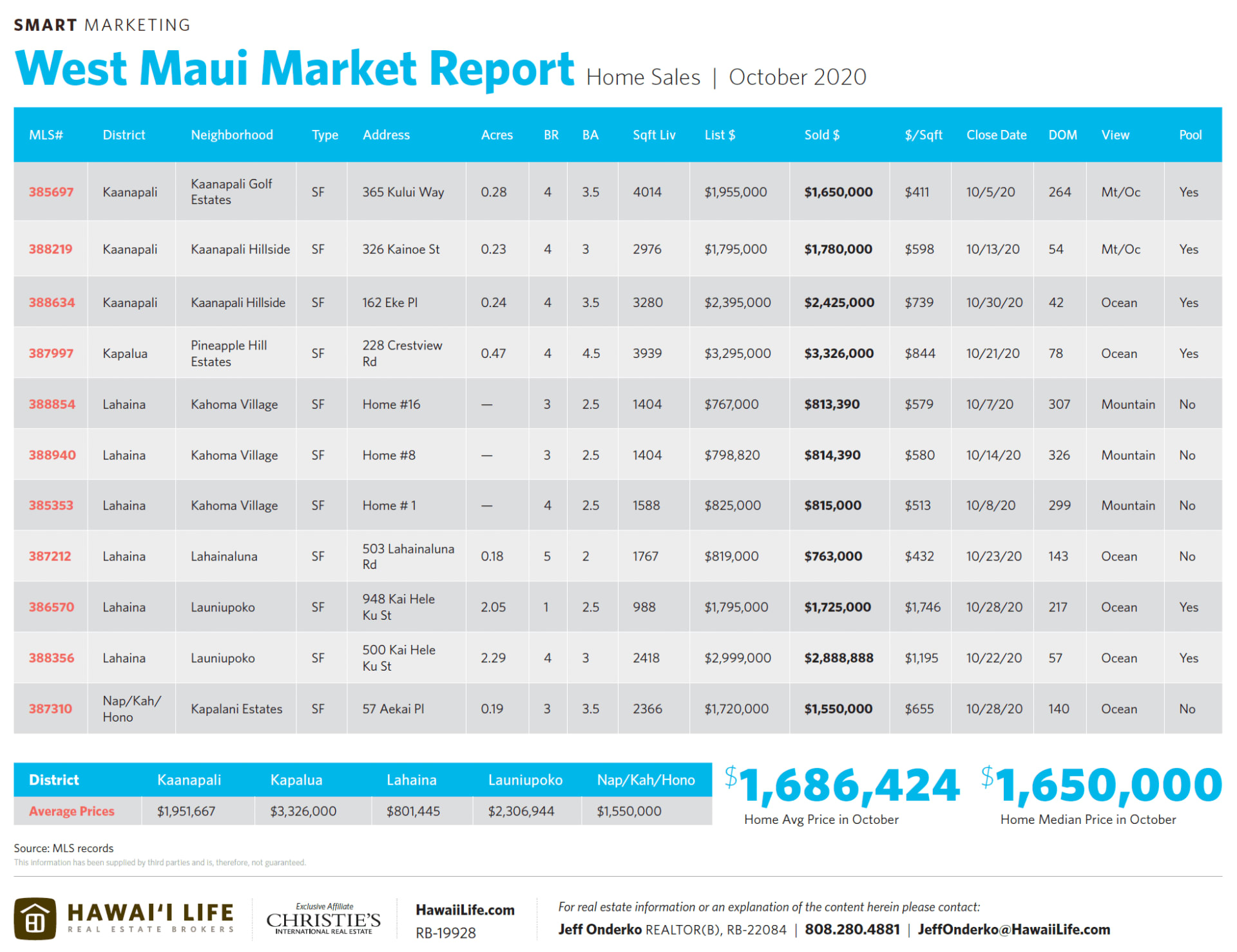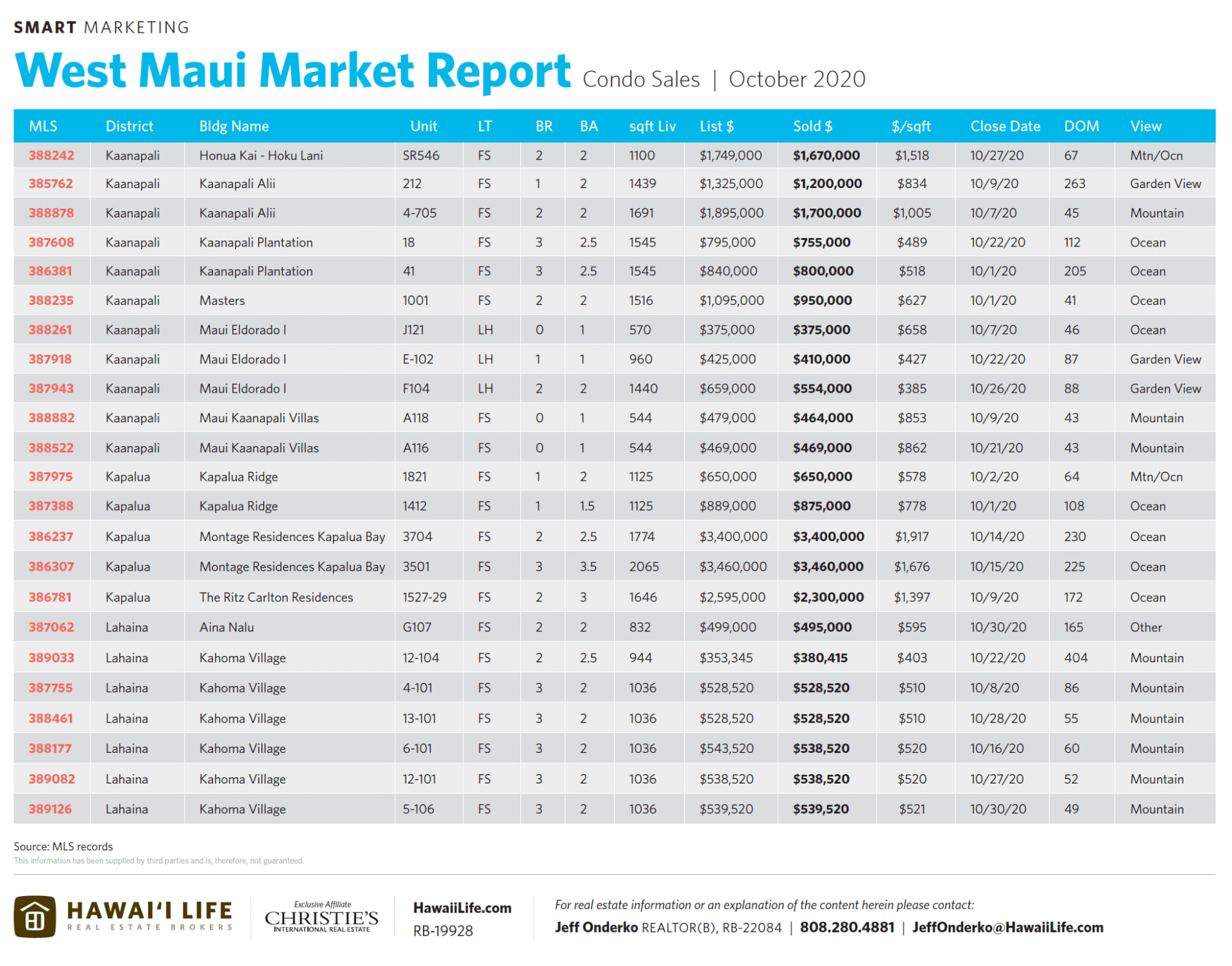 As it is my commitment to keeping the local community informed, I am pleased to share with you the most recent West Maui home, land, and condo sales reports for your review covering Kaanapali, Kapalua, Lahaina, and Launiupoko. You’ll find real estate sales volume, days on market, list versus sold price, price per square foot, and significantly more.