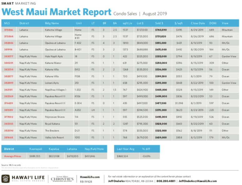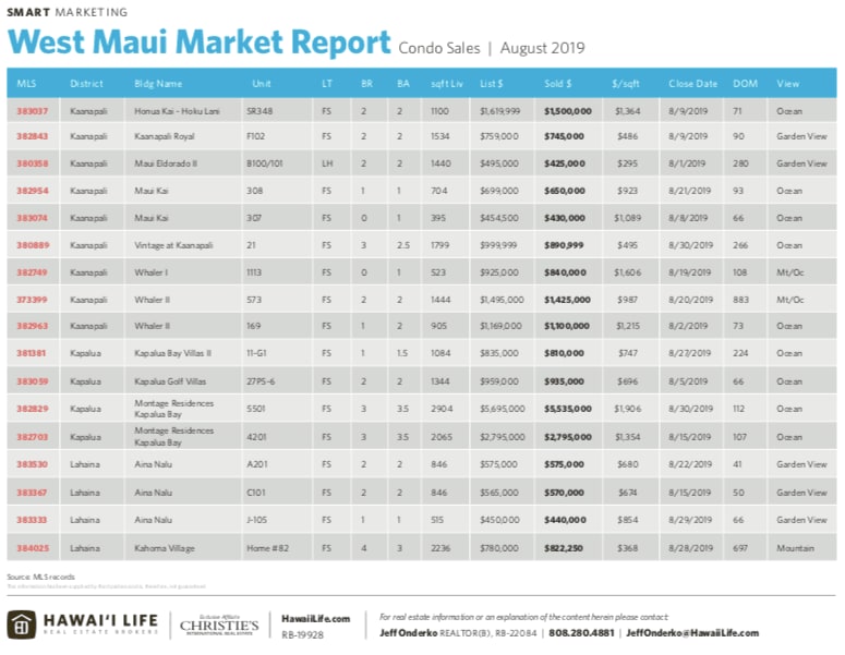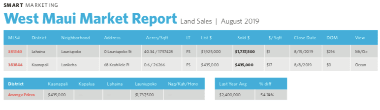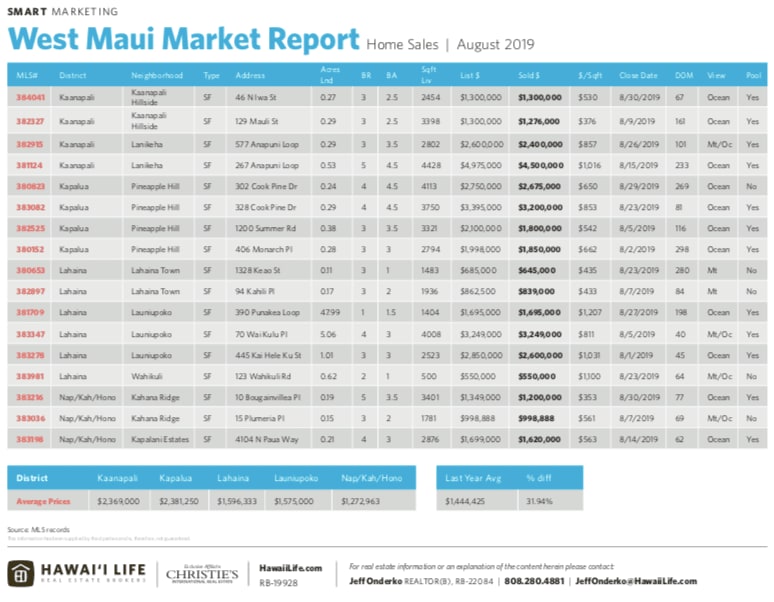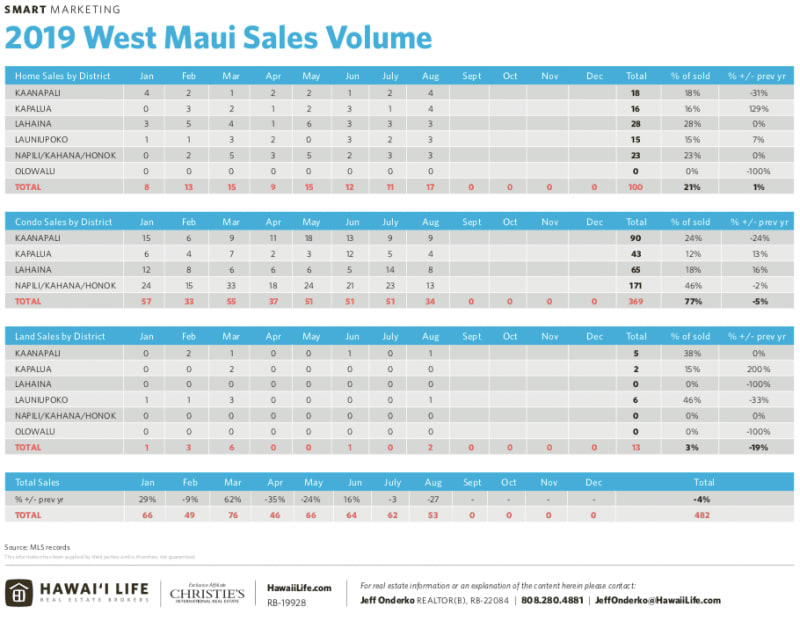 Sales volume in West Maui is feeling its first year over year decline since 2017 and sits at currently -4% (yes there was a decline in transactions from 2017/2016). However, 2018 with 695 transactions had a 7% volume increase compared 2017, so it’s easy to say we are still in an actively churning market. From a pricing standpoint, homes saw a significant increase of +32% over the same period last year ($1.9M v $1.44M), while condos saw a slight -.6% decline at $863K v $868K.For the Year