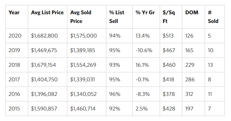 - Currently 6 properties remain actively listed for sale ranging from $1.15M – $2.97M