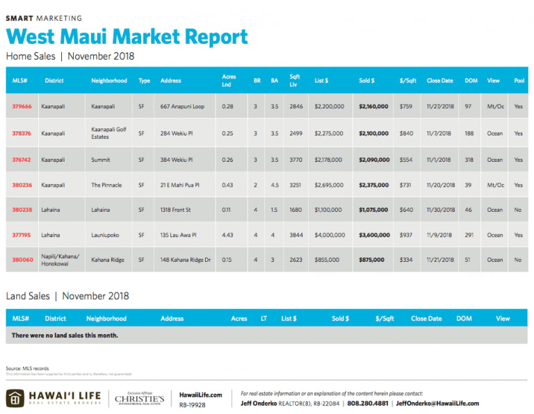 Turkey hangover, a recent move, a weekend excursion to the Big Island for WorthShop 8 and holiday planning have literally kept me in a publishing straightjacket the past 15 days, so my apologies for the delay in sharing with you the most recent West Maui home, land, and condo sales reports — covering Kaanapali, Kapalua, Lahaina, and Launiupoko. You’ll find real estate sales volume, days on market, list versus sold price, price per square foot and more. Please stay tuned for my Annual West Neighborhood Power Index Report hitting HawaiiLife.com next month.