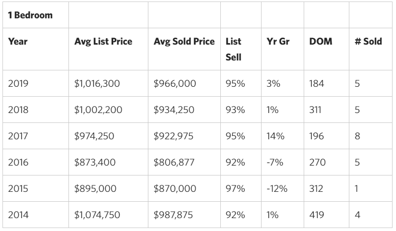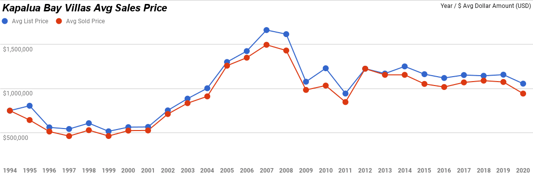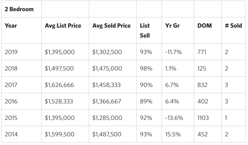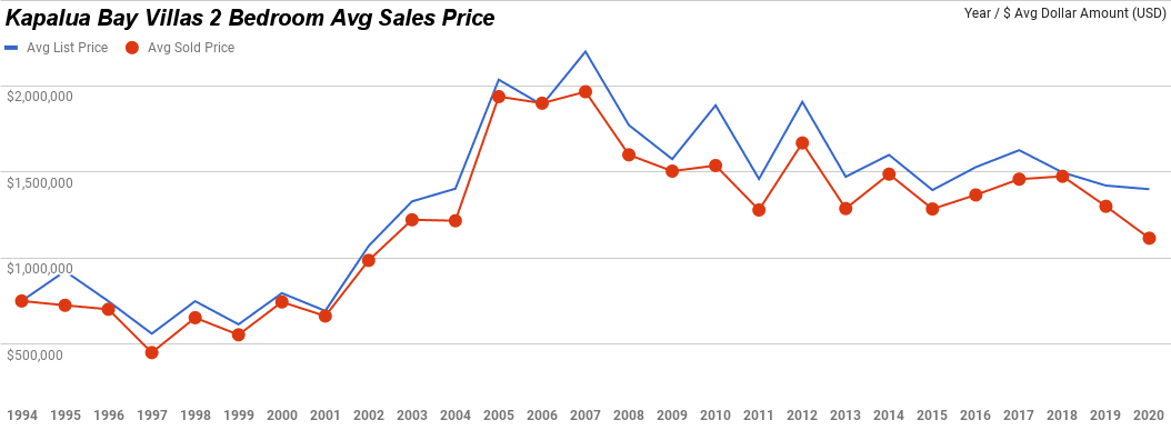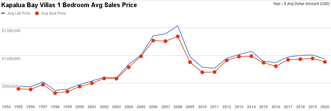 - There have been 7 Bay Villa sales this year, and with one under contract it is looking for certain KBV will improve on the 7 transactions all of last year. From a price standpoint: The $966K 1-bedroom average sales price is a 3% increase over last year. However, 2-bedrooms are down 11% with an average sales price of $1.302M in 2019.