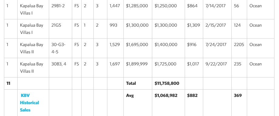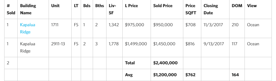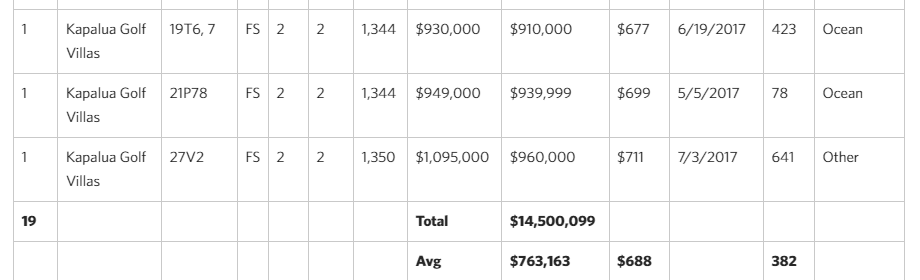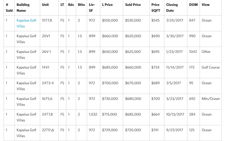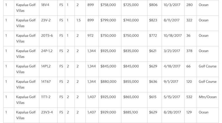 - Most Transactions – Kapalua Golf Villas (19 units or 37% of total sales volume) Average Price: $763K