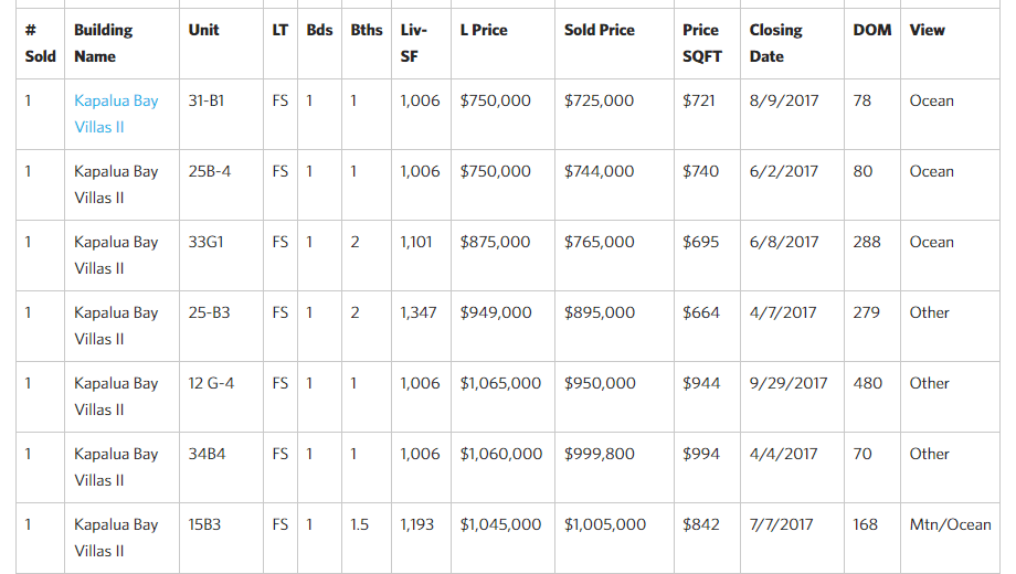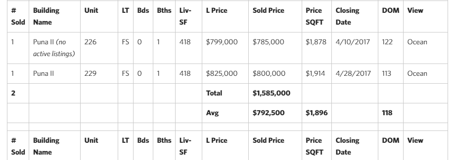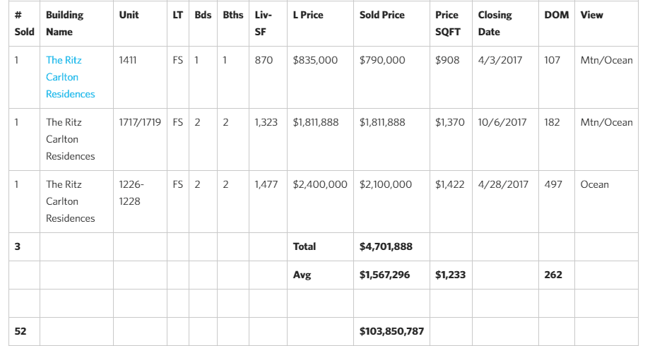 2017 Kapalua Condominium Sales (as of 11/28/2017)