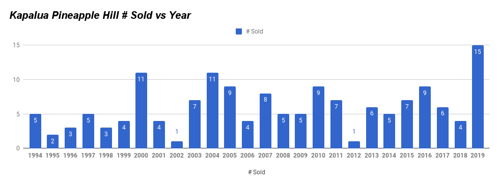 - A new bar has been set as there have been 15 Pineapple Hill sales this year. That’s right, nearly 15% of the entire neighborhood has traded hands and this is over the course of only 9 months.. The previous sales record in a single calendar year by was 11 (both 2004 & 2000 had 11).