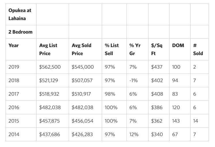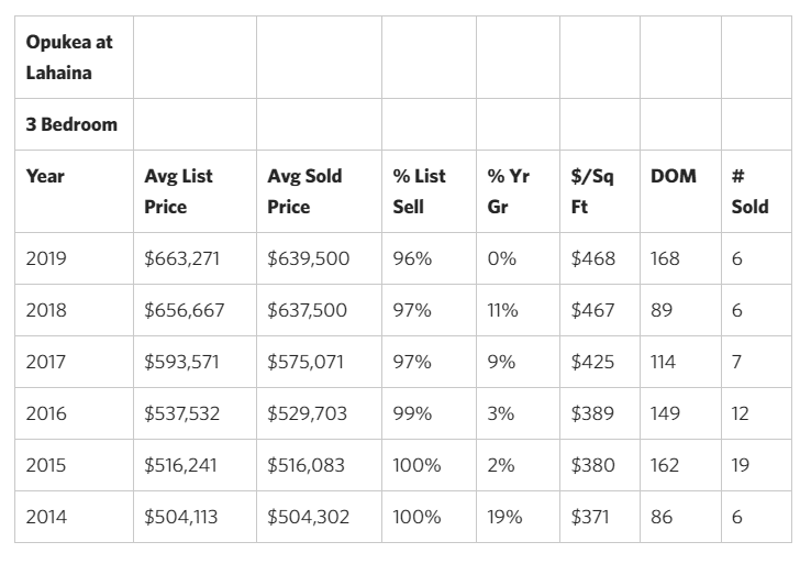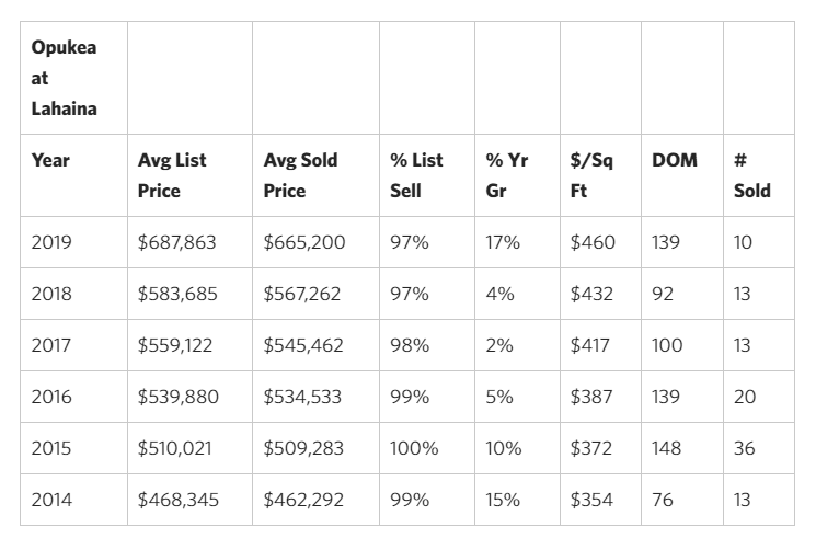 - Opukea sales have been moderately hot this year. In summary — volume is steady, avg sales prices are up 17%, and days on market well under the West Maui average for comparable property. This marks the 6th year in a row that Opukea has seen positive price growth.