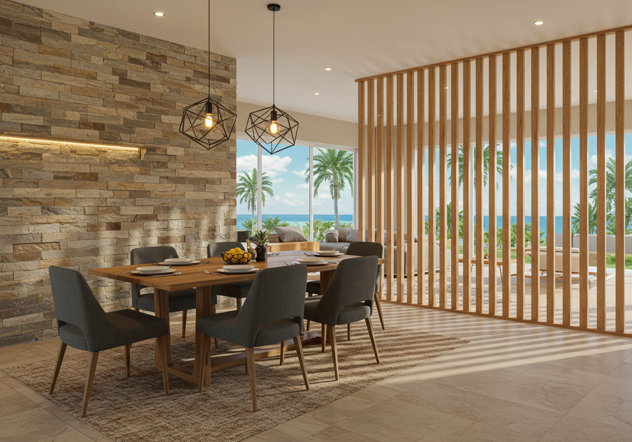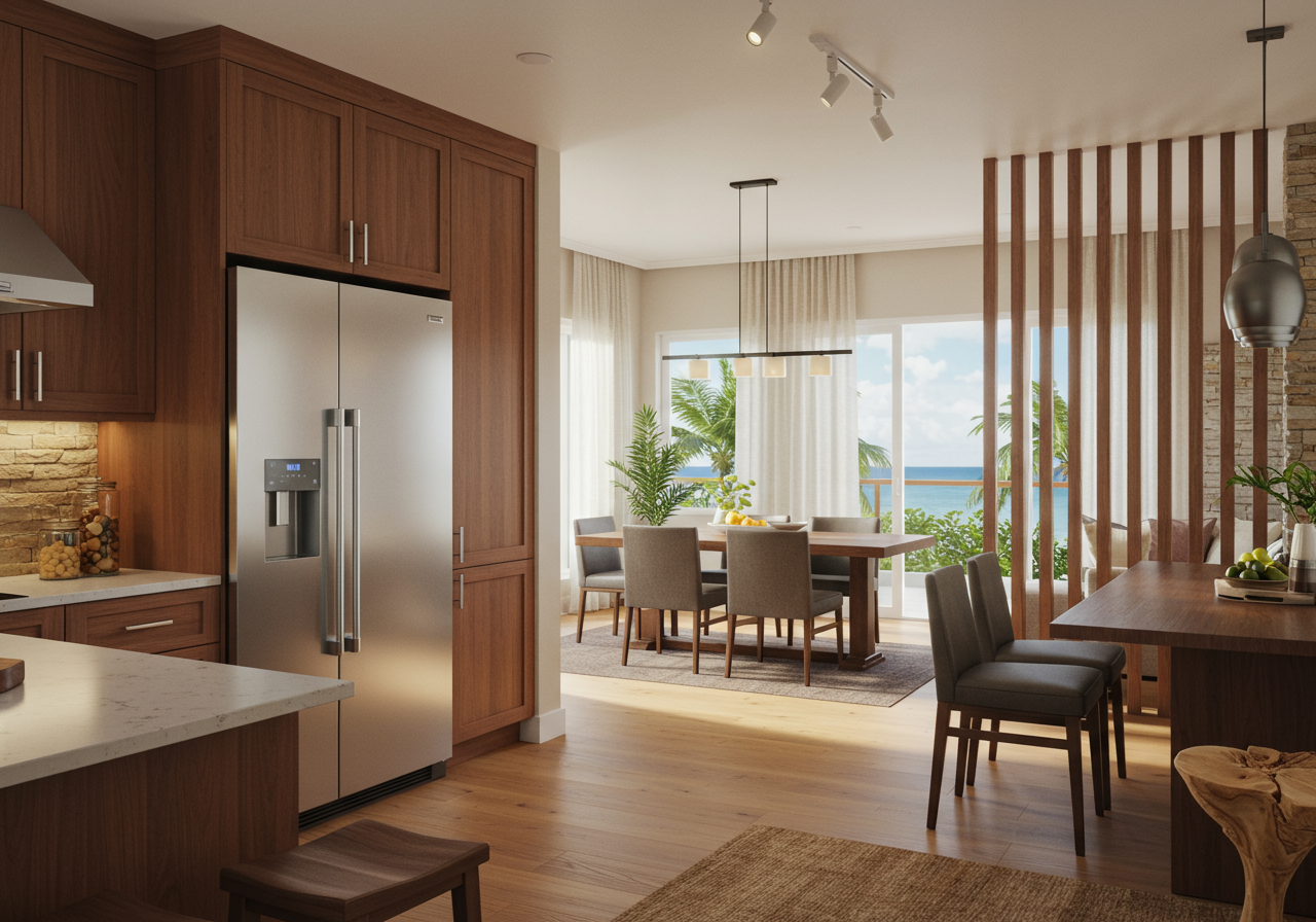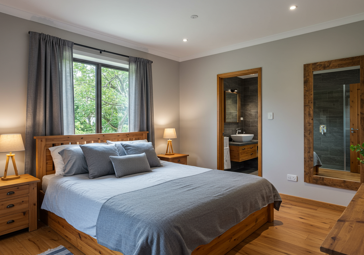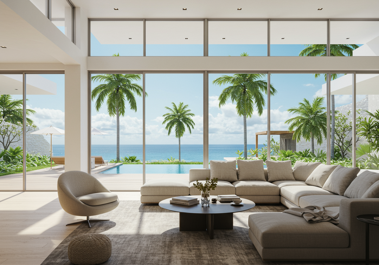 You’ll find wood floors, granite countertops, stone, slate, and glass tiling, modern fixtures, automatic retractable blinds, recessed lighting, split system air conditioning, nearly floor-to-roof windows that look out over the property to ocean and island views. The ocean view detached 1 bed/1 bath cottage sits above the 2 car garage.