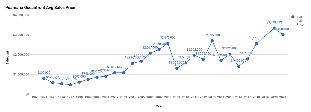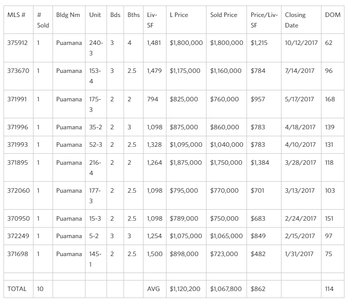 Currently – there are 3 active listings for sale and 1 pending under contract. This time last year – Inventory was abnormally high with 11 active listings. Plus we hadn’t seen but 1 sale since July and the election hangover thing was in full effect. This time 5 years ago – the average sale price in Puamana was $815K.