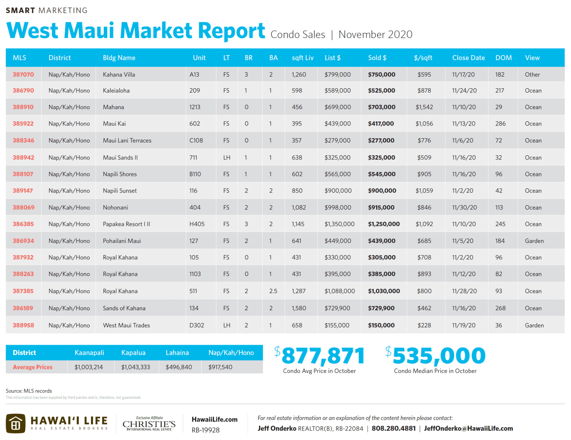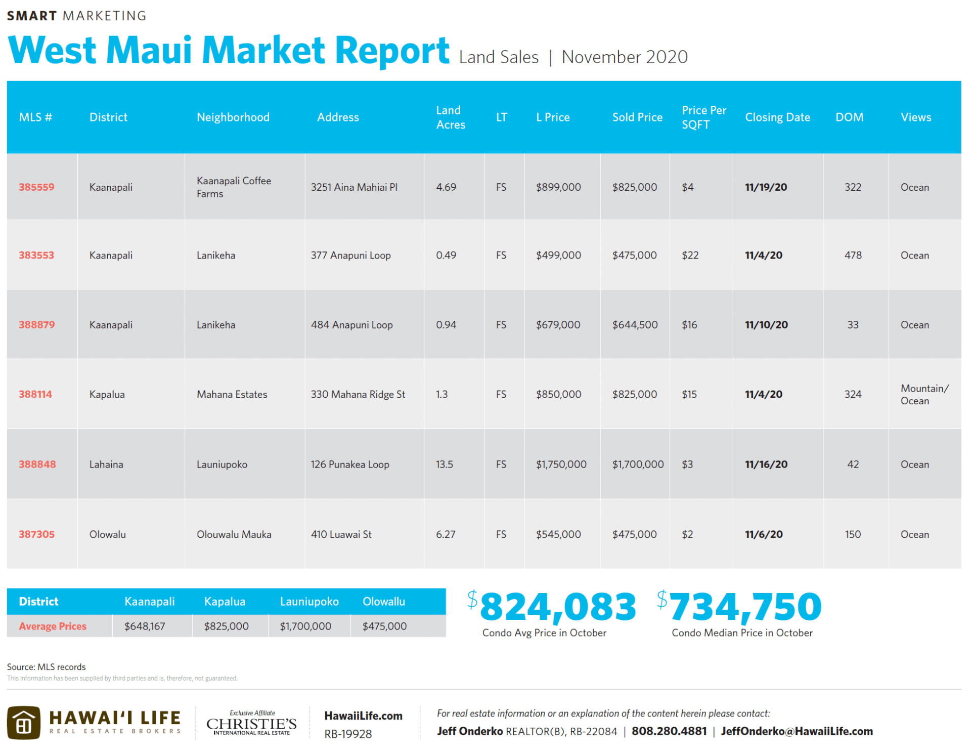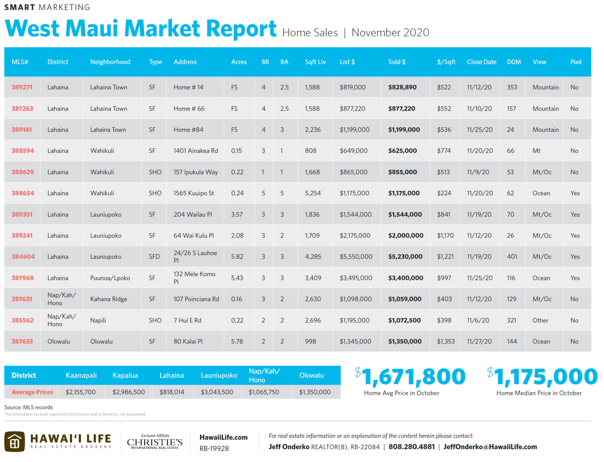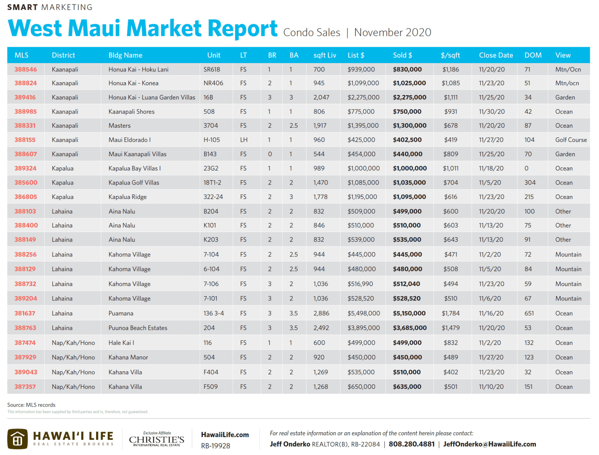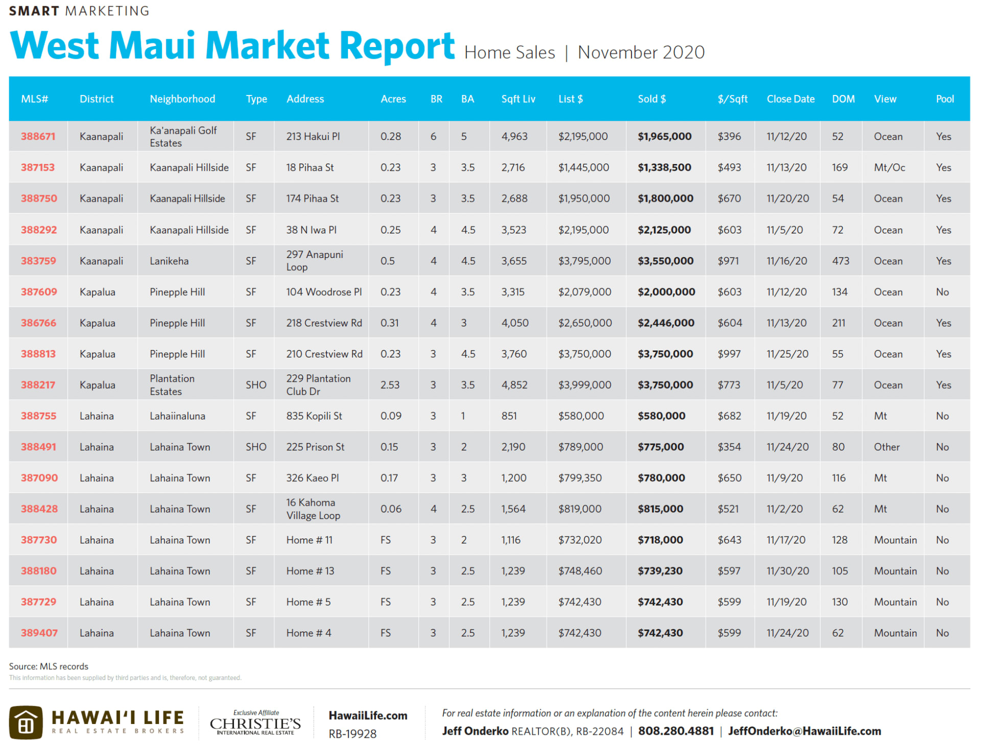 With that being said, I am pleased to share with you the most recent West Maui home, land, and condo sales reports for your review — covering Kaanapali, Kapalua, Lahaina, and Launiupoko. You’ll find real estate sales volume, days on market, list versus sold price, price per square foot, and significantly more.