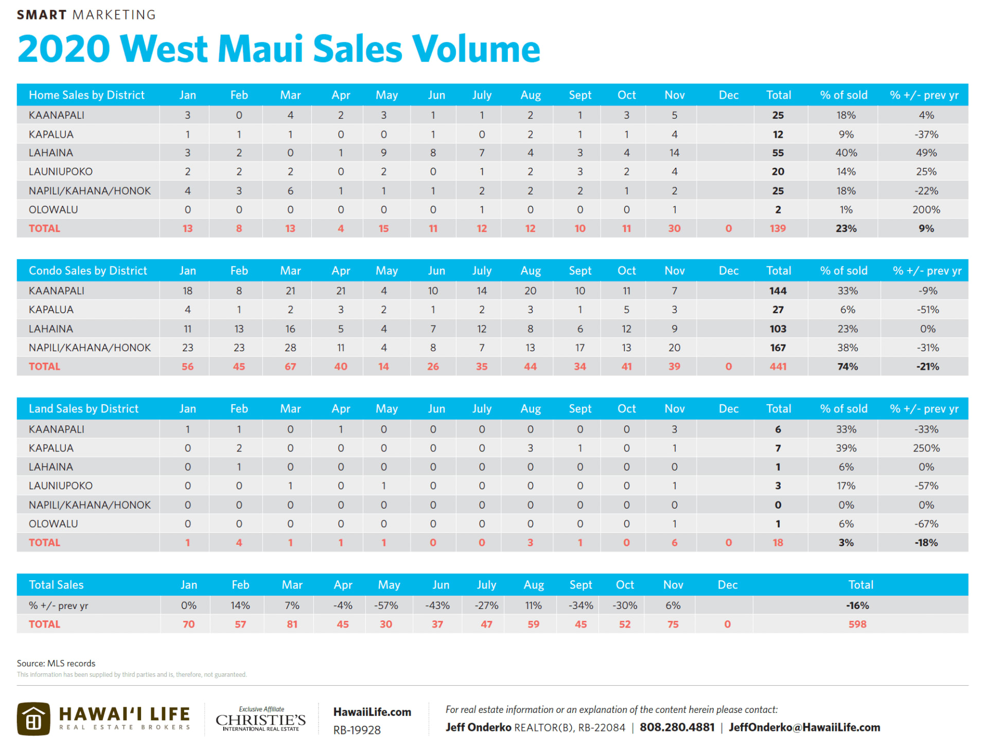 As we head into month 12 of 2020, West Maui Residential Home sale volume is up 9% over 2019, which could be considered a shockingly fantastical statistic after what the state of Hawaii and our island has experienced this year. A not-so-shockingly fantastical statistic is that West Maui condominium sales are down -21% in 2020.