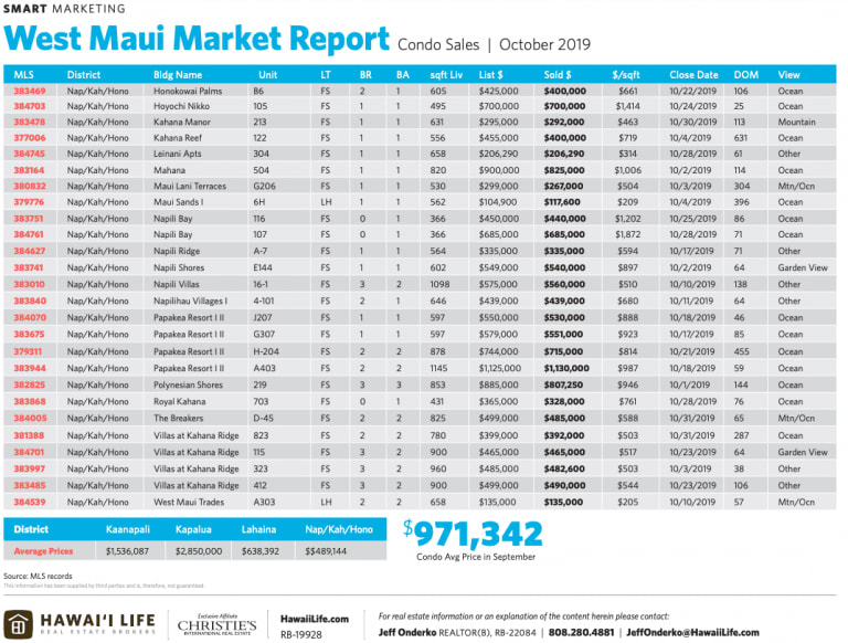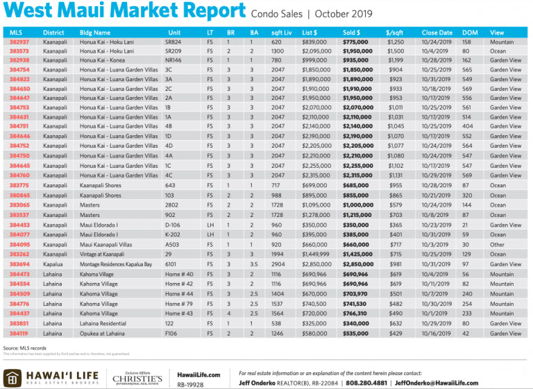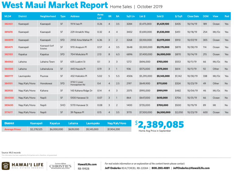 As it is my commitment to keeping the local community informed, I am pleased to share with you the most recent West Maui home, land, and condo sales reports for your review — covering Kaanapali, Kapalua, Lahaina, and Launiupoko.